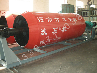 圓筒洗石機清洗筒體被四個(gè)拖輪支撐,電機帶動(dòng)減速機,大小齒輪帶動(dòng)清洗筒體低速旋轉。含有泥團和石粉的骨料自進(jìn)料口給入,進(jìn)入旋轉的回轉滾筒清洗機滾筒內,被清洗滾筒內安裝有一定角度的耐磨橡膠襯板不斷帶起拋落,自進(jìn)料端到出料端移動(dòng)過(guò)程中多次循環(huán),并被順向或逆向的沖洗水沖涮洗滌,清洗干凈的骨料經(jīng)過(guò)卸料端筒篩篩分脫水后排出。含有污泥的廢水則通過(guò)出料或給料端的帶孔擋板流出。